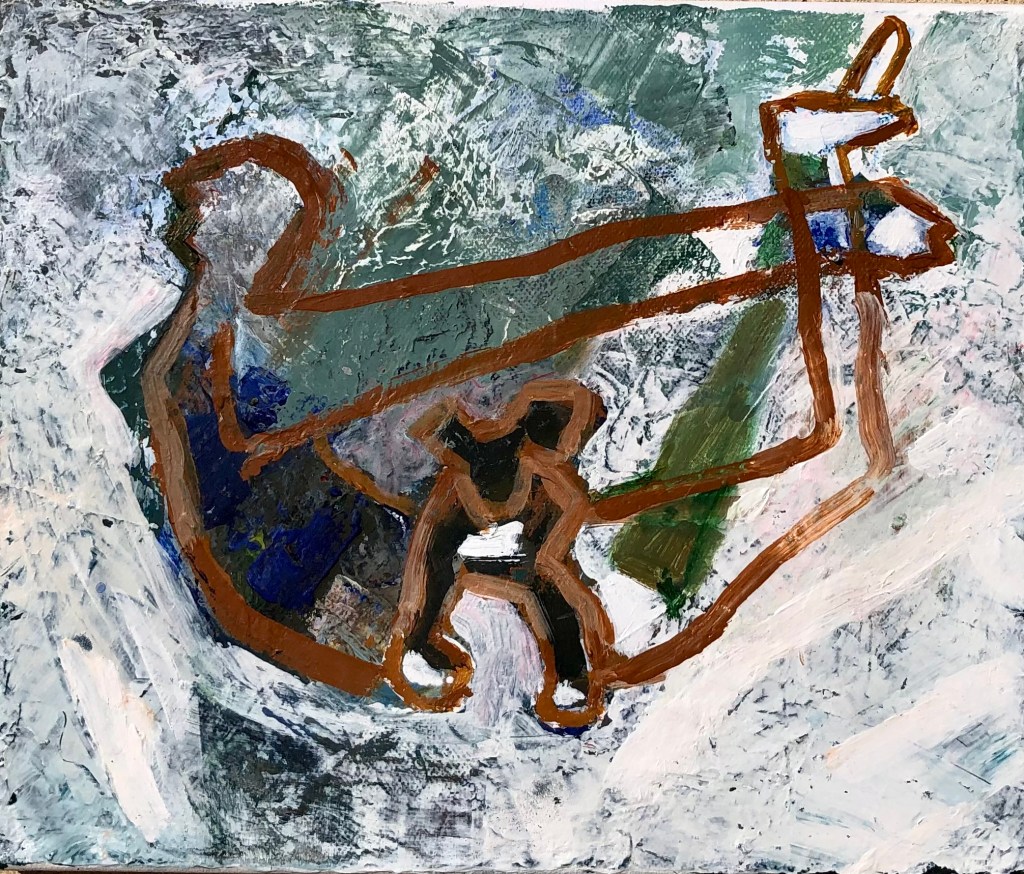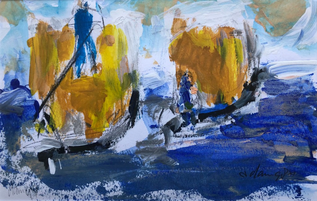 Pont “op zee” serie van 25 -de overvaartkosten zijn zo hoog dat je er wel een cruise van kan maken- alle verkochtDe Gabrielle van Jaap Koeman 70X70 acryl op doek 750,-De Dankbaarheid acryl op doek 40X30 275,-Pontveer en Dankbaarheid verkochtZwemwedstrijd- kermis De Woude prvé